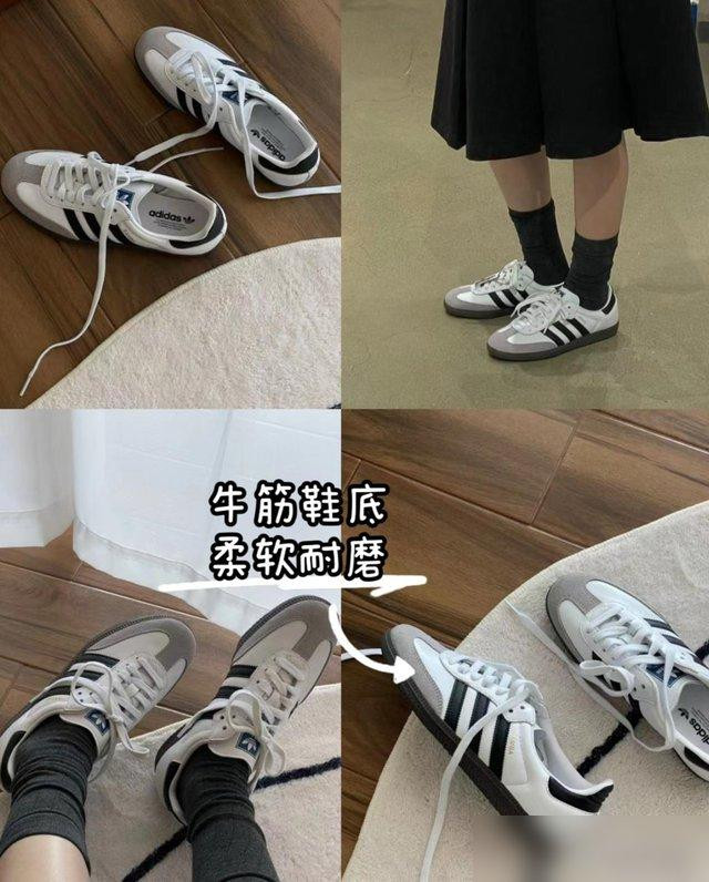 再说samba鞋,真是“中年鞋柜的救星”!以前穿高跟鞋走两步脚就疼,穿运动鞋又太像学生,这鞋牛筋底软得像踩棉花,复古圆头的鞋型配直筒牛仔裤刚好露出鞋边,或者搭微喇裤把鞋头露出来——不用露脚踝也能显腿长,夏天吹空调还不怕关节受凉,这不比露脚踝实用一百倍?关键是它能“中和”冲锋衣的“硬感”,把“户外装备”拉回“日常时尚”,穿出去既有运动风的舒服,又有复古鞋的质感。